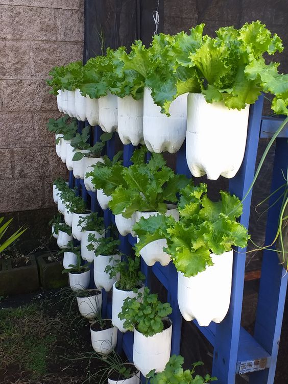 Há várias opções de vasos para uma horta em varanda, incluindo jardineiras, vasos suspensos, e até garrafas PET recicladas, como na imagem abaixo.