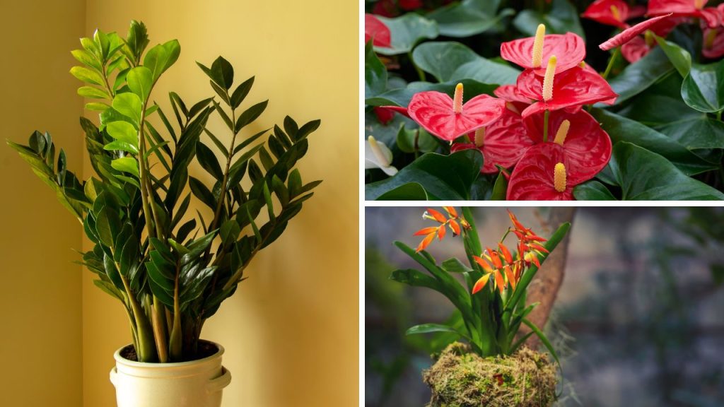 O antúrio, com suas flores em forma de coração, é outra opção clássica para jardins internos. Ele vem em várias cores, desde o vermelho vibrante até tons mais claros. Gosta de solo úmido, mas sem encharcamento.